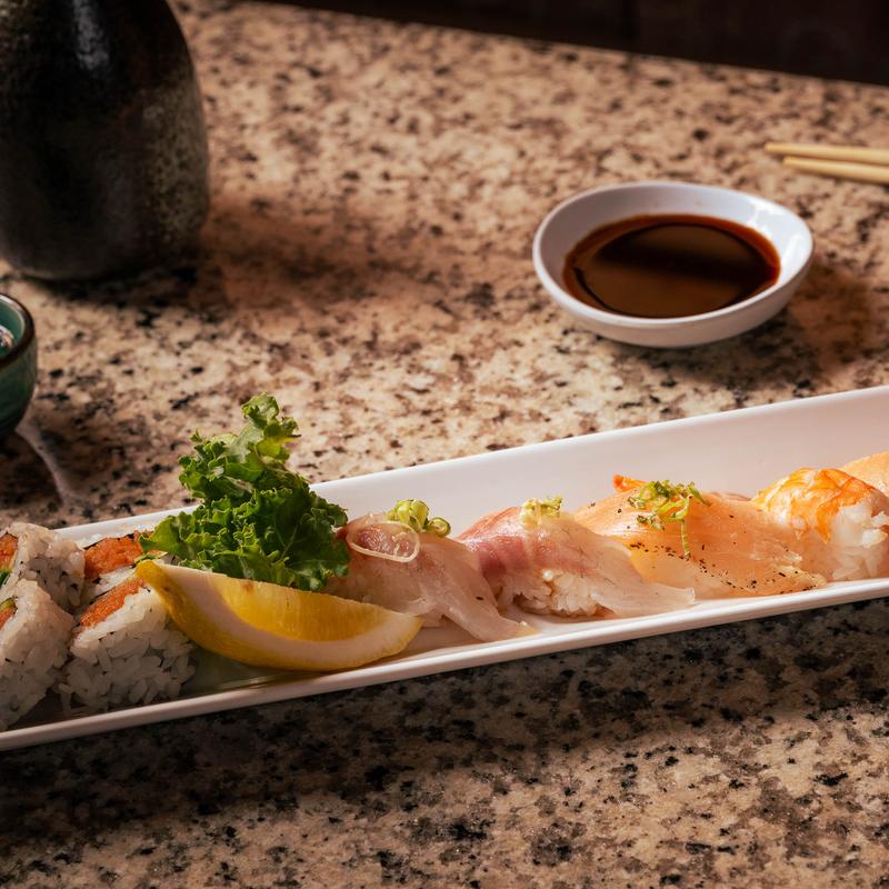 8 pieces of sushi and a selection of 1 roll from the following: baked langostino roll, Hawaiian roll, rainbow roll, tiger roll, spider roll, or caterpillar roll. Served with miso soup.