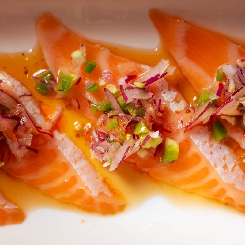 Tuna, salmon, yellowtail, avocado, gobo, ponzu, and mustard soy.