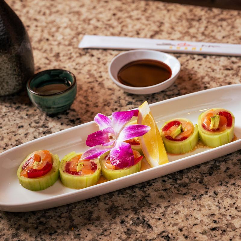 Asparagus, avocado, cucumber, gobo, yellowtail with ponzu and mustard soy.